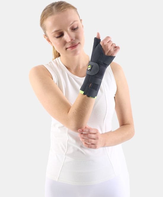 Neopren kumaştan üretilmiştir. El bileği ve baş parmak anatomisine uygun olarak tasarlanmıştır. Elastik yapısı ile dokulara kompresyon yaparak kasları güçlendirir şişliği engeller. Alüminyum atel yardımı ile el bileğinin ve başparmağın hareketini tamamen kısıtlar ve istirahate alır. Bilek çevresinde stabilizasyonu arttıran bandajı mevcuttur.