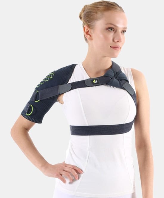 Esnek hava alabilen, 3D örme teknolojisi kullanılarak üretilmiştir. Örgü tekniği sayesinde uyguladığı kompresyon etkisi ödemi engeller, kaslardaki tonusu azaltarak ağrıyı azaltır. Elastik bandajları omzun arkasından geçer, koltuk altından dolaşarak önde birleşir ve maksimum stabilizasyon sağlar. Yumuşak yapıdaki bandajları rahatsızlık hissi vermez ve cildi tahriş etmez. Sağı ve solu mevcuttur.